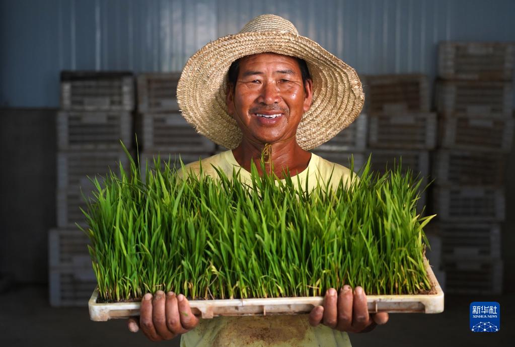 在江西省南昌县大田农社,农民手捧秧盘展示秧苗(7月20日摄)。