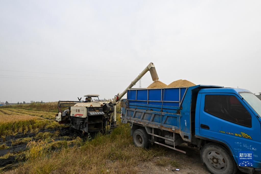 10月13日,在天津市津南区小站镇坨子地村,新收稻谷正在装车。