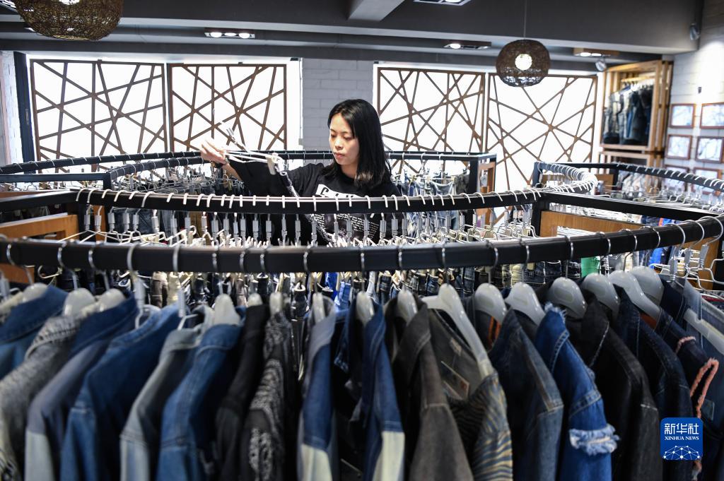 在广东省纺织品进出口股份有限公司,工作人员在整理广交会线上展厅的服装(10月14日摄)。