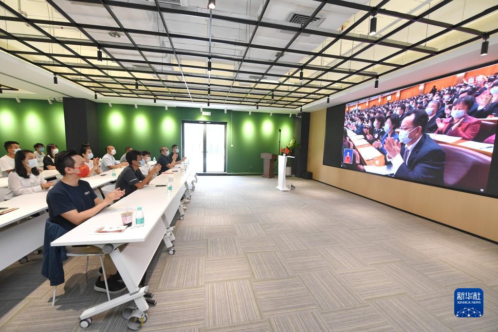 10月16日,在广东省深圳市前海深港青年梦工场北区,在前海工作的青年收看中国共产党第二十次全国代表大会开幕会。