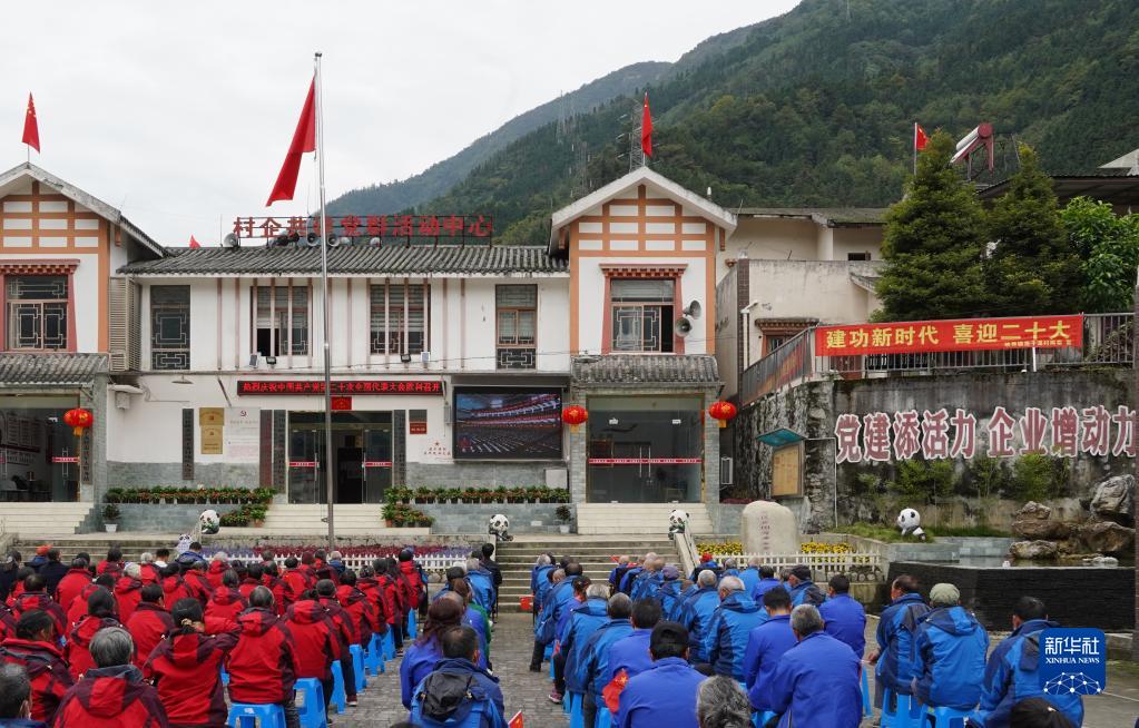 10月16日,在四川省阿坝州汶川县映秀镇渔子溪村,村民在收看中国共产党第二十次全国代表大会开幕会。