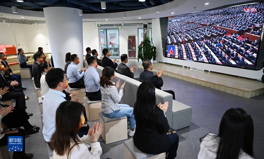 10月16日,在天津市滨海新区滨海-中关村科技园,企业员工在收看中国共产党第二十次全国代表大会开幕会。