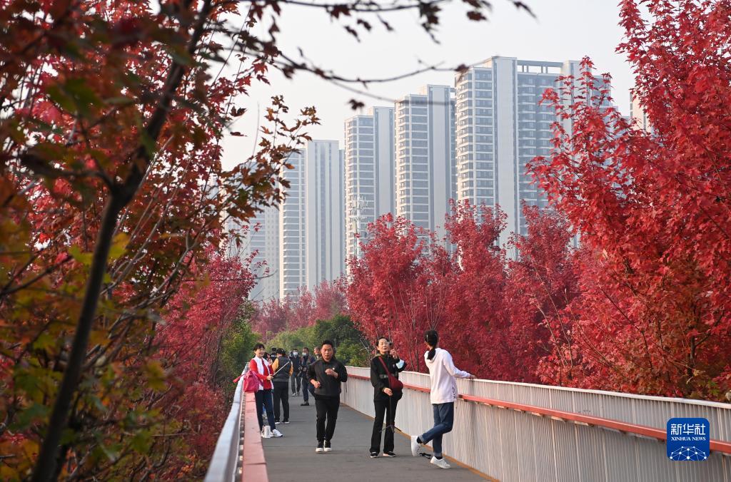 近日,古城西安市雁塔区雁南公园里秋色正浓,吸引游客赏景游玩。