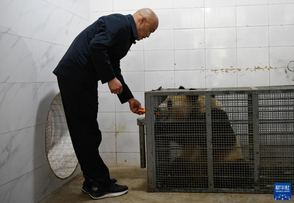 10月18日,在中国大熊猫保护研究中心雅安基地,饲养师董礼用胡萝卜安抚进入转运笼的大熊猫“四海”。
