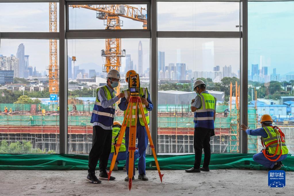 由中建深装承建的央企中国电子总部大厦进入幕墙同步安装阶段,技术人员在对首片弧面幕墙玻璃进行放线测量(10月19日摄)。