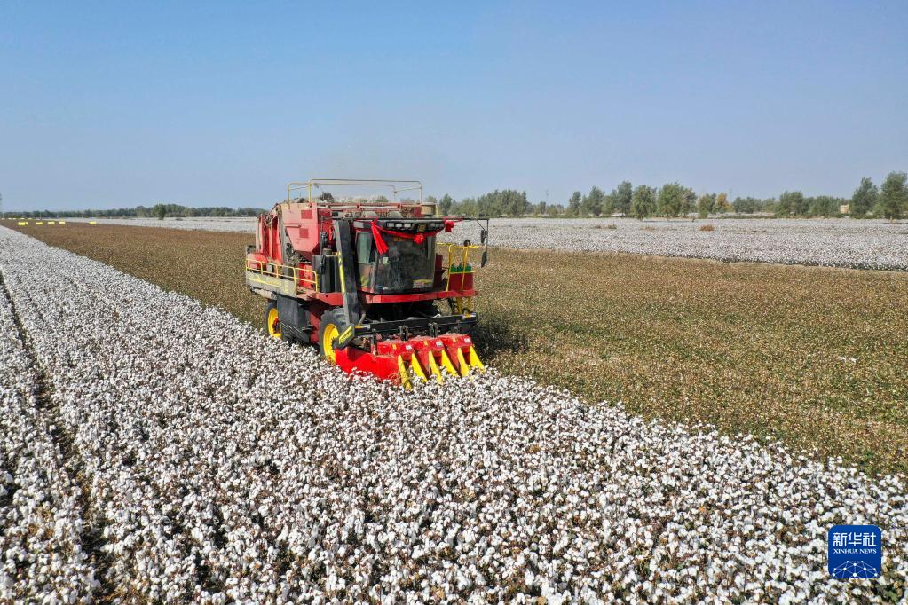 在新疆巴音郭楞蒙古自治州尉犁县兴平镇巴西阿瓦提村的一块棉田里,国产采棉机在采收棉花(10月14日摄,无人机照片)。