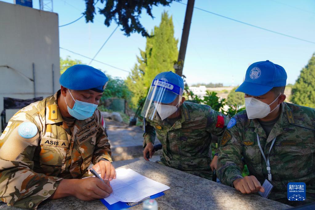 10月19日,在黎巴嫩南部辛尼亚村中国维和营区,评估组官员为中国第21批赴黎巴嫩维和多功能工兵分队进行评估。