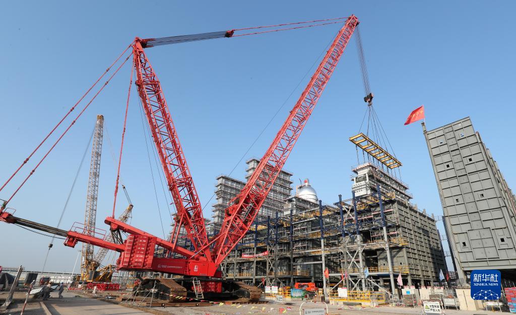 在中石化天津南港乙烯项目建设现场,施工人员在安装裂解炉模块(10月7日摄)。