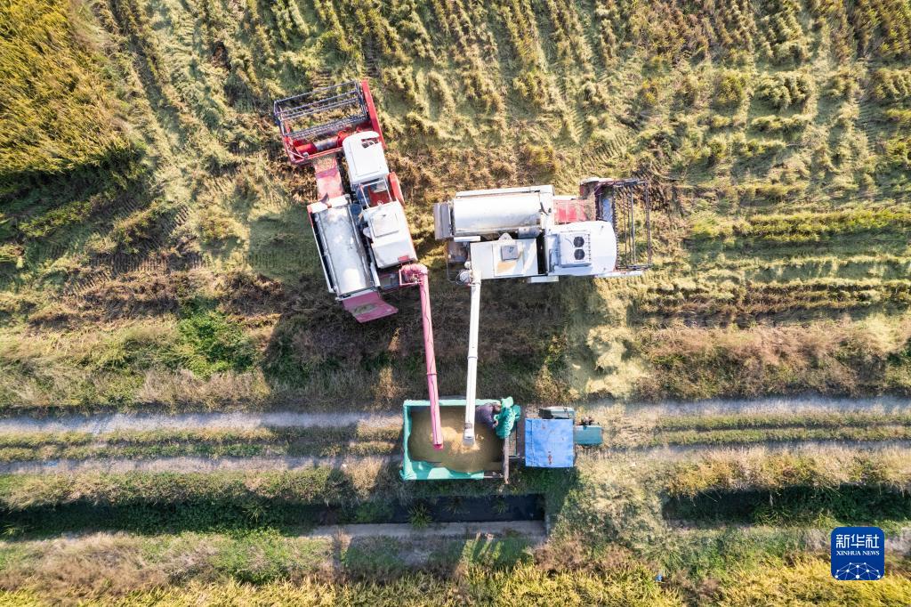 10月20日,在湖南省常德市鼎城区谢家铺镇,收割机把收好的稻谷转放到运输车里(无人机照片)。
