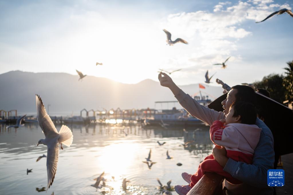 10月20日,市民在滇池畔投喂红嘴鸥。 新华社记者 王冠森 摄
