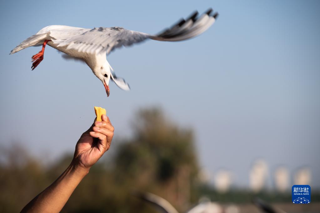 10月20日,市民在滇池畔投喂红嘴鸥。 新华社记者 王冠森 摄