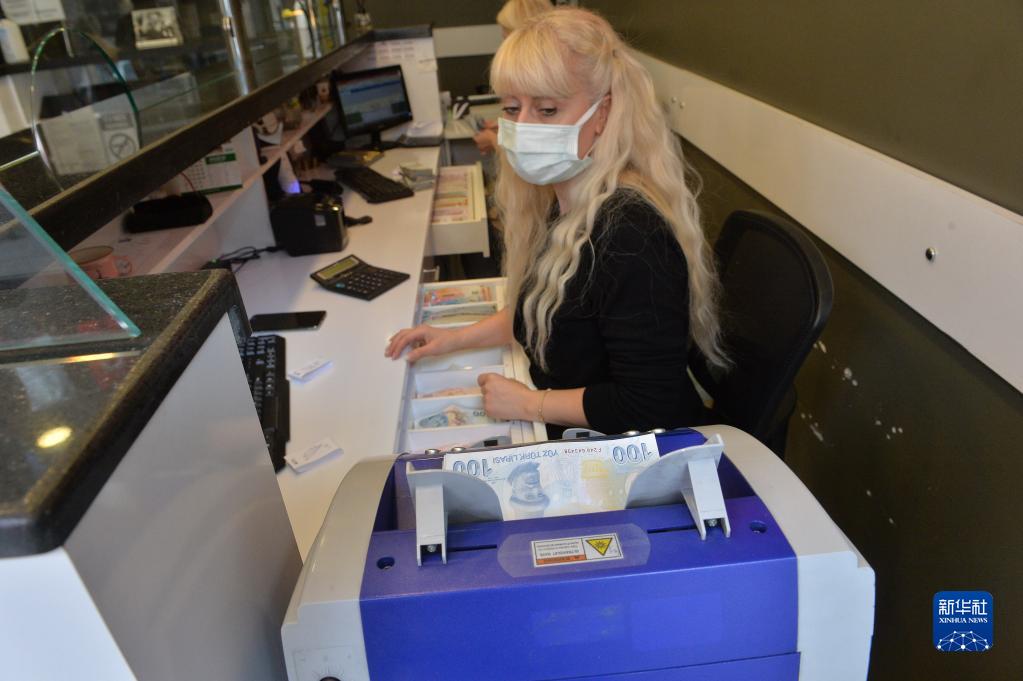 10月20日,工作人员在土耳其安卡拉的一处货币兑换点清点纸币。