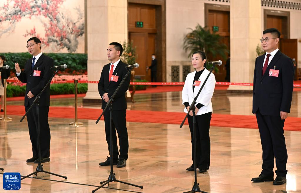 这是闭幕会后,杨新泉、刘秀祥、石玉莲、安长明代表(自左至右)接受采访。