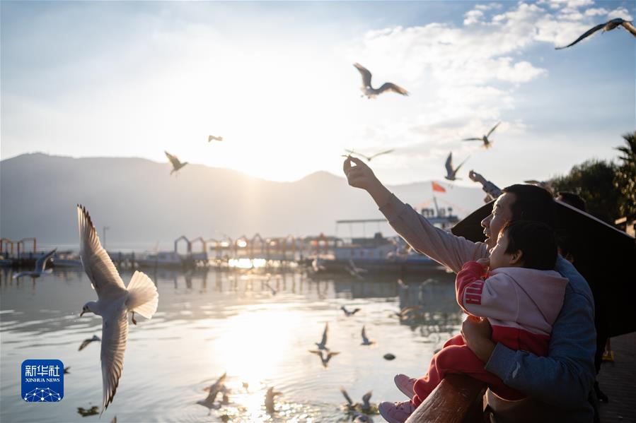 10月20日,市民在云南滇池畔投喂红嘴鸥。