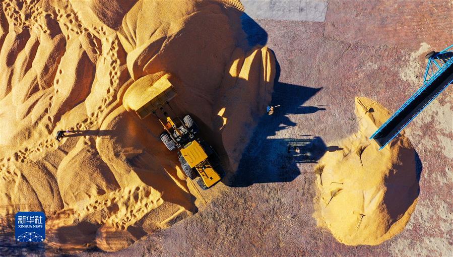 10月18日,在通辽市奈曼旗新镇舍布日图嘎查,工人在收粮站晾晒玉米(无人机照片)。