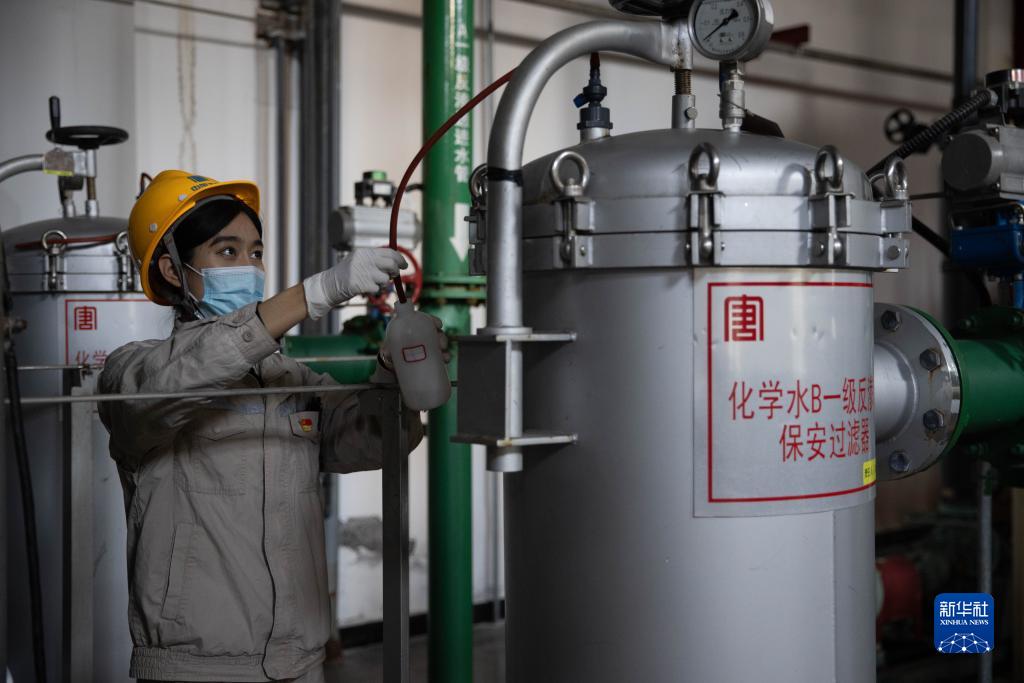 10月24日,在大唐绥化热电有限公司供热车间内,化验员张馨月在进行水质采样。