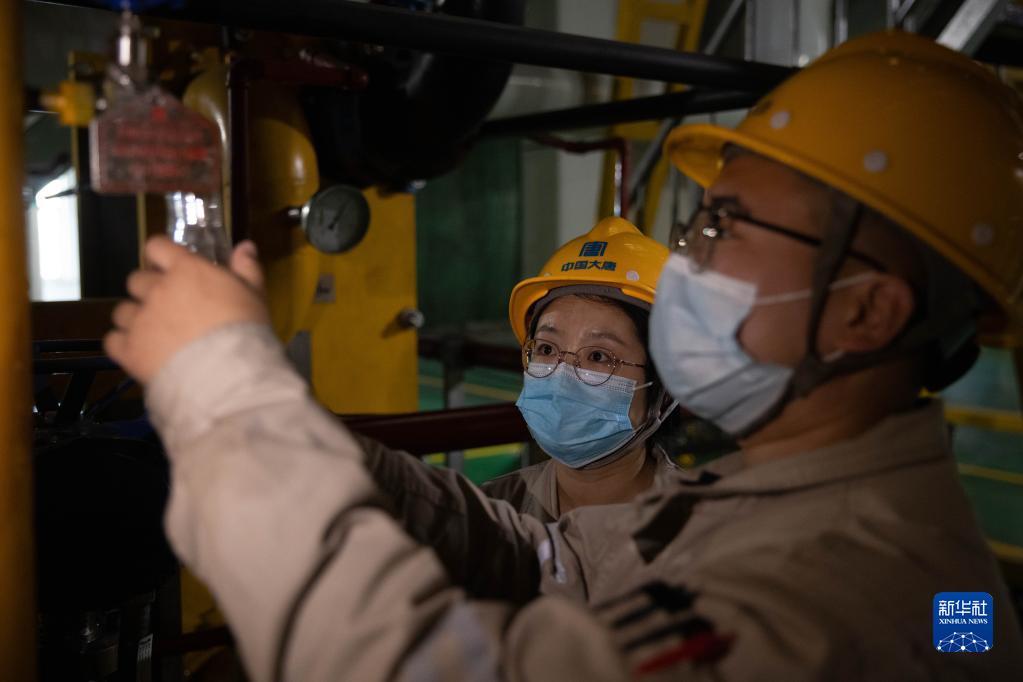 10月24日,在大唐绥化热电有限公司供热车间内,化验员在进行油质采样。