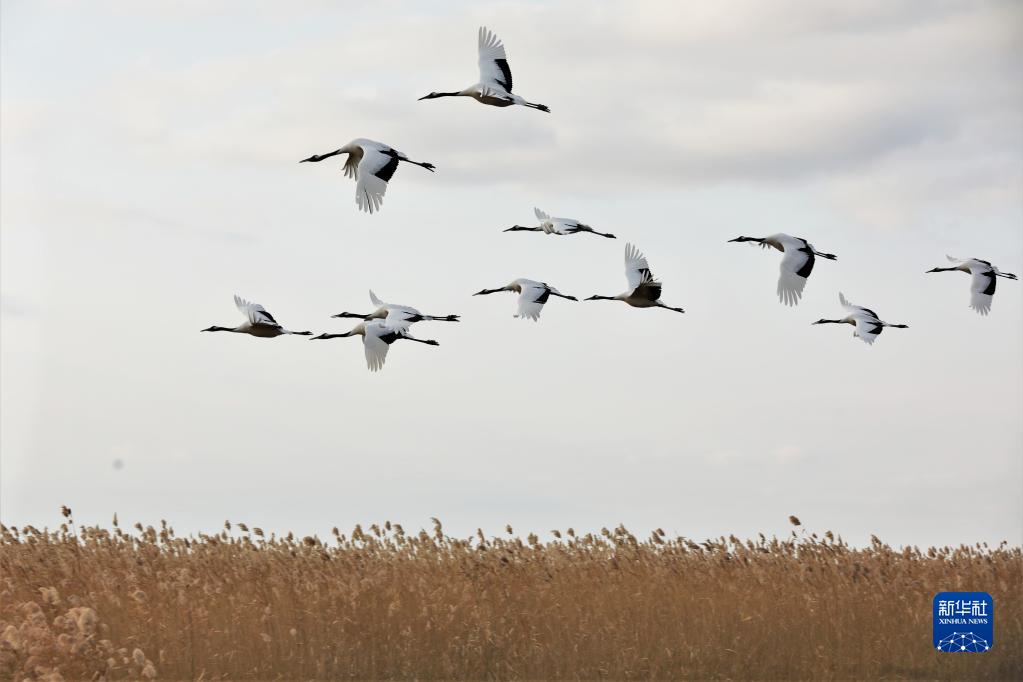 丹顶鹤在黑龙江扎龙国家级自然保护区自由翱翔(2022年10月21日摄)。 新华社发(宋燕军 摄)