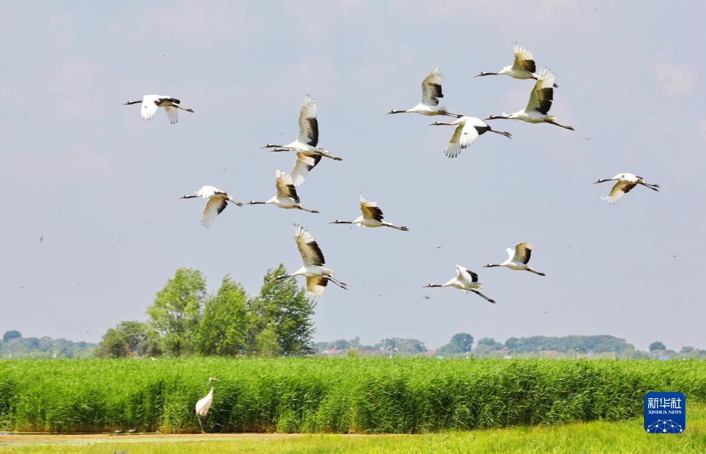 丹顶鹤在黑龙江扎龙国家级自然保护区自由翱翔(2022年6月15日摄)。 新华社发(宋燕军 摄)
