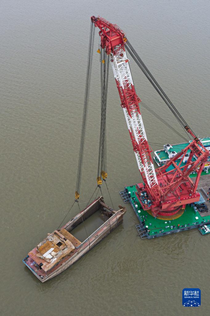 10月25日,碍航历史沉船“二航9566”被吊出水面(无人机照片)。 新华社记者 肖艺九 摄