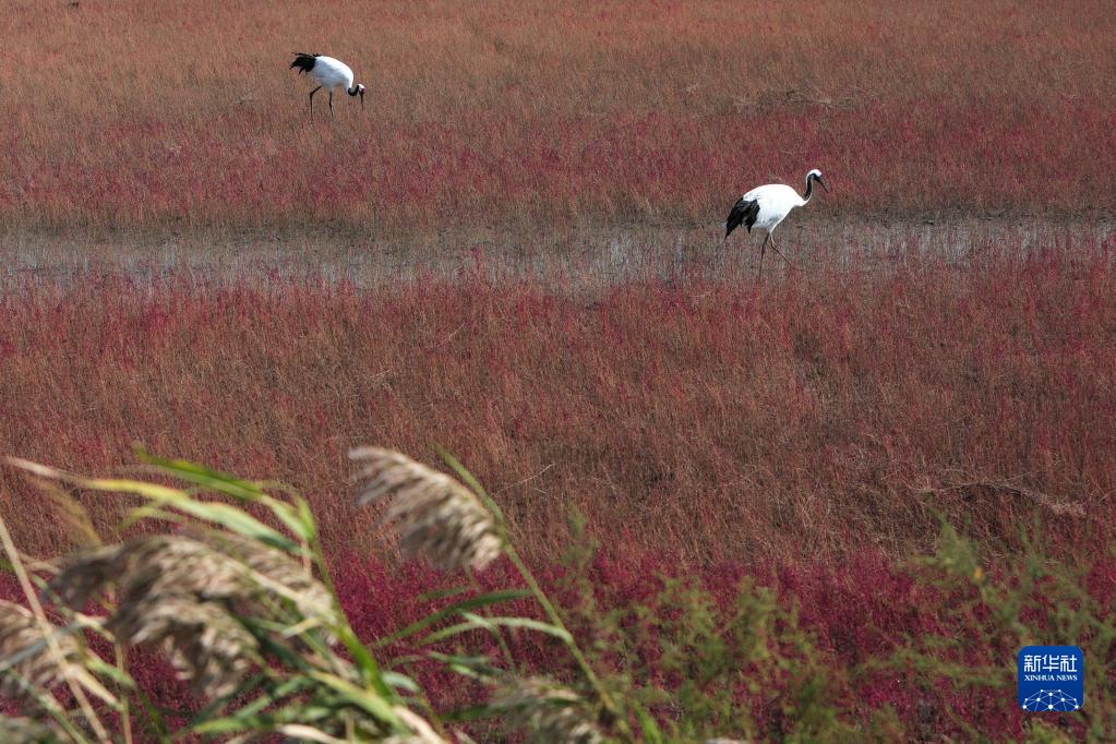 两只丹顶鹤在辽河口国家级自然保护区觅食(2022年9月28日摄)。