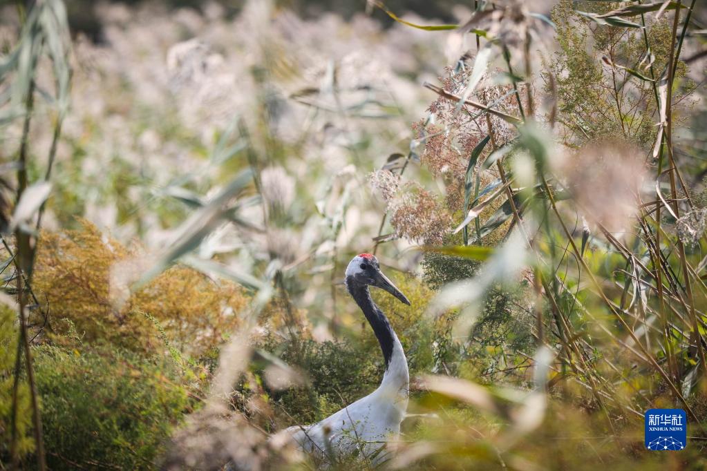 一只丹顶鹤在辽河口国家级自然保护区觅食(2022年9月28日摄)。