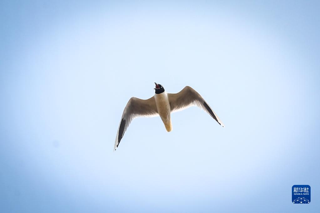 在辽河口国家级自然保护区南小河保护站附近的湿地,黑嘴鸥在空中飞翔(2022年6月17日摄)。