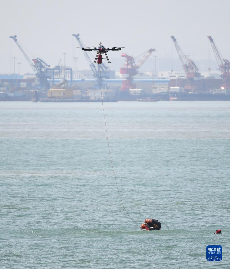 10月27日,无人机在演练海域抛下救生筏。