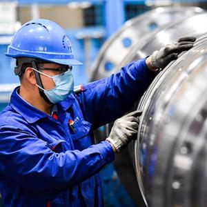 哈电集团哈尔滨汽轮机厂有限责任公司工人在生产车间作业(10月27日摄)。