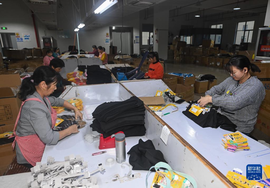 10月27日,在浙江省诸暨市大唐街道的一家企业车间内,工人在包装保暖裤袜。