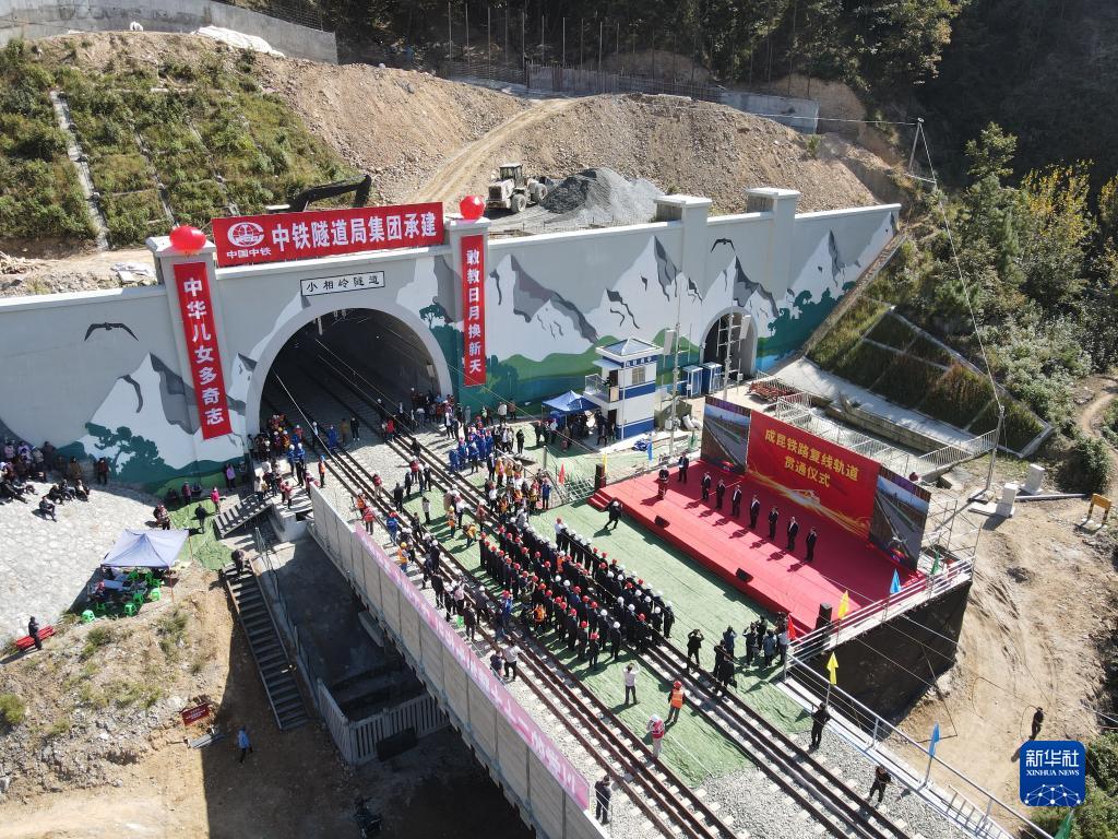 这是10月28日在四川省凉山彝族自治州喜德县小相岭隧道口拍摄的成昆铁路复线轨道贯通仪式(无人机照片)。