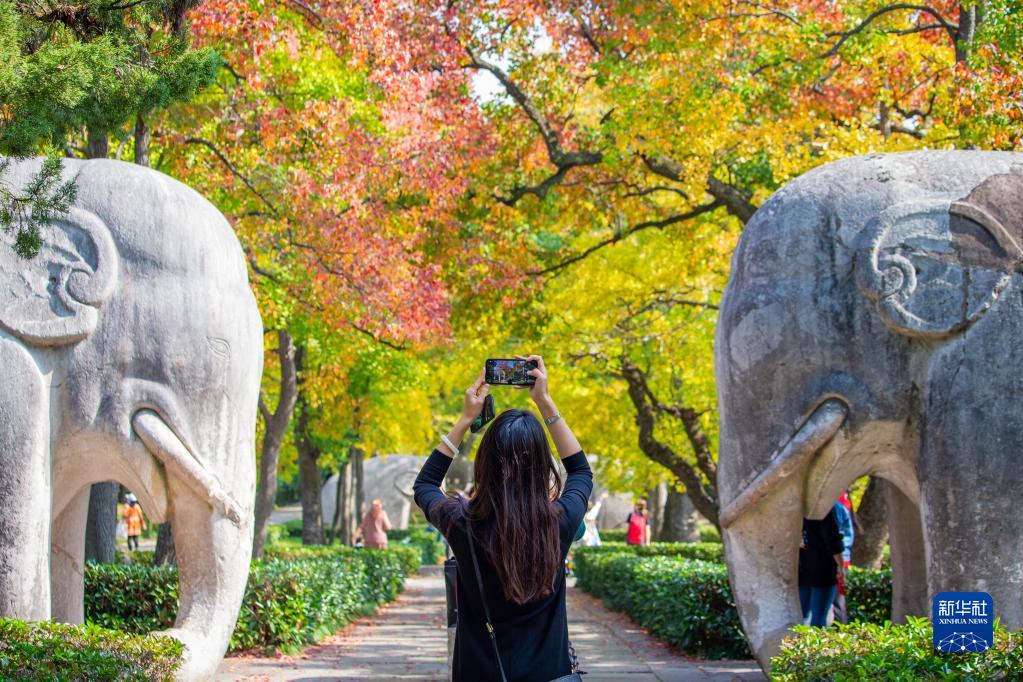 10月23日,游人在江苏省南京明孝陵景区石象路赏景拍照。