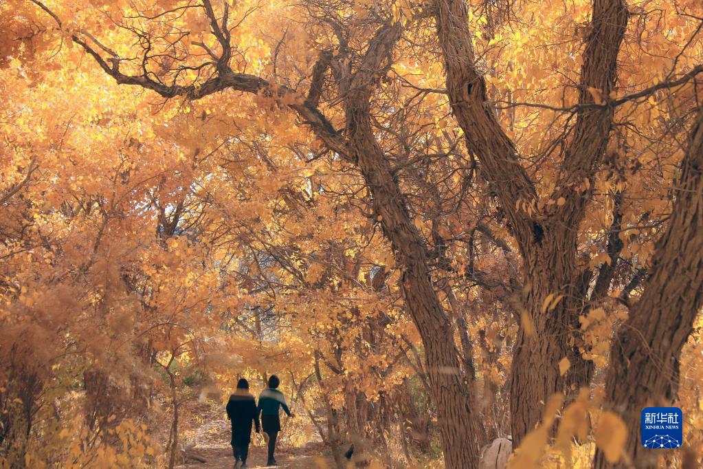 10月25日,游客在甘肃省敦煌市莫高镇的胡杨林中游玩。