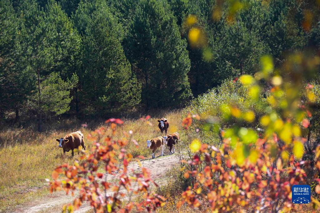 9月14日,牛群在河北省承德市御道口草原森林风景区的草场觅食。