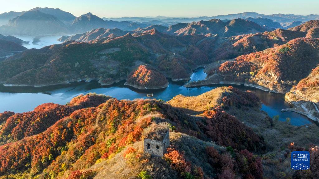 10月24日在河北省承德市与唐山市交界处的潘家口水库拍摄的长城秋景(无人机照片)。