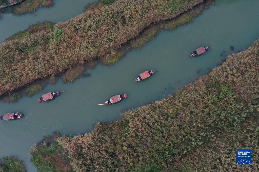 游客乘坐摇橹船在西溪湿地欣赏芦花(2019年11月3日摄,无人机照片)。