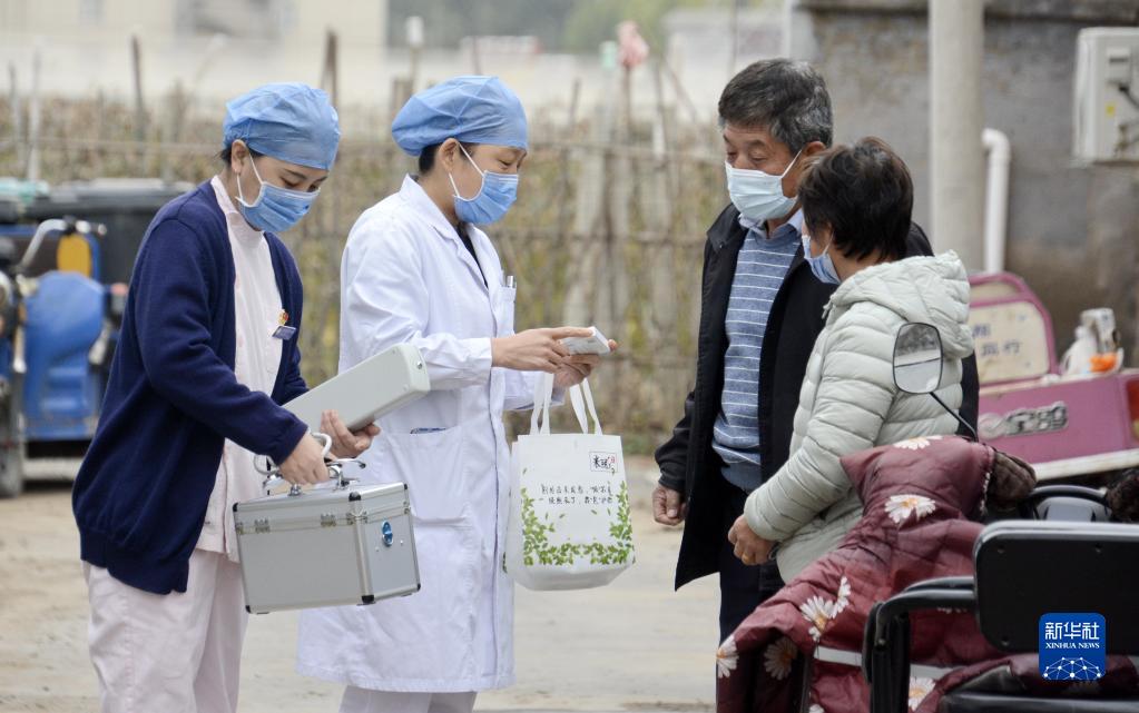 北京市大兴区采育镇社区卫生服务中心的农村医务巡诊团队的医护人员来到施家务村为村民上门送药(10月27日摄)。