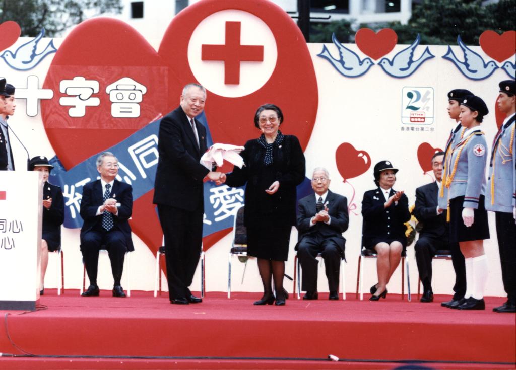 1997年,时任中国红十字会会长钱正英同志向香港红十字会赞助人、时任香港特首董建华授旗。
