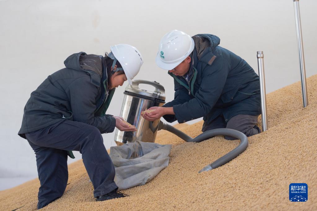10月28日,在中央储备粮哈尔滨直属库有限公司,工作人员用扦样器对新收购入库的大豆进行取样,以便后续检测以了解其水分、杂质以及虫害等情况。