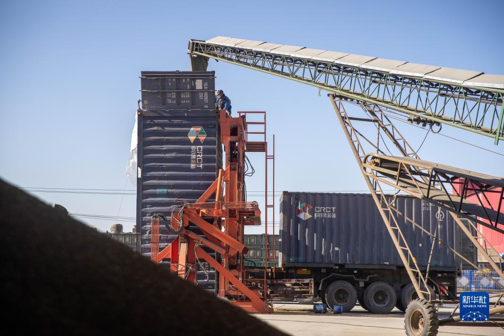 10月25日,在绥化市益盛粮食购销有限公司内,工人利用机器将大豆装入铁路货运集装箱。