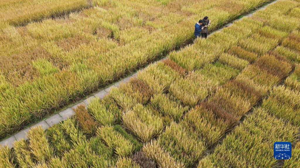 10月27日,在中科院合肥研究院智能所离子束生物工程与绿色农业研究中心的育种基地里,研究员刘斌美(右)和副研究员叶亚峰观察用于科研的水稻表型(无人机照片)。