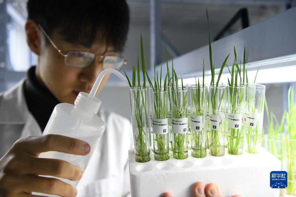 10月27日,在中科院合肥研究院智能所离子束生物工程与绿色农业研究中心,博士生姜鸿瑞给培育中的水稻加水。