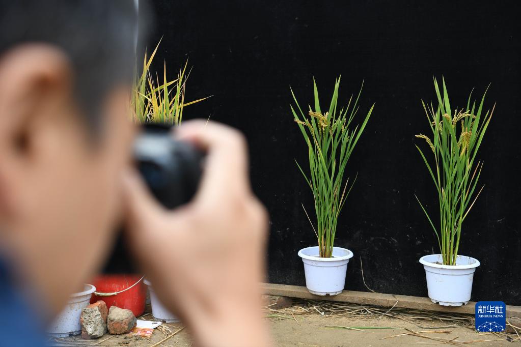 10月27日,在中科院合肥研究院智能所离子束生物工程与绿色农业研究中心的育种基地,副研究员叶亚峰给用于科研的水稻拍照。