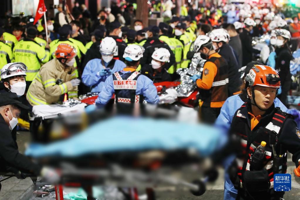 10月30日凌晨,在韩国首尔市龙山区梨泰院洞一带,救护人员在现场工作。