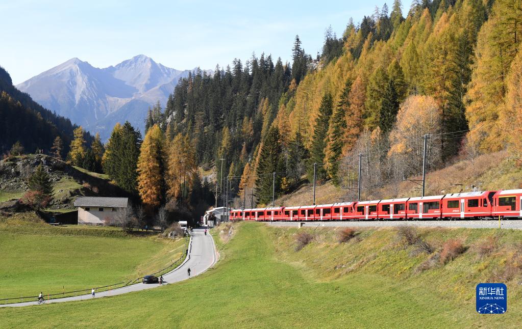 10月29日,世界最长窄轨客运列车在位于瑞士阿尔卑斯山区的雷蒂亚铁路网上行驶。