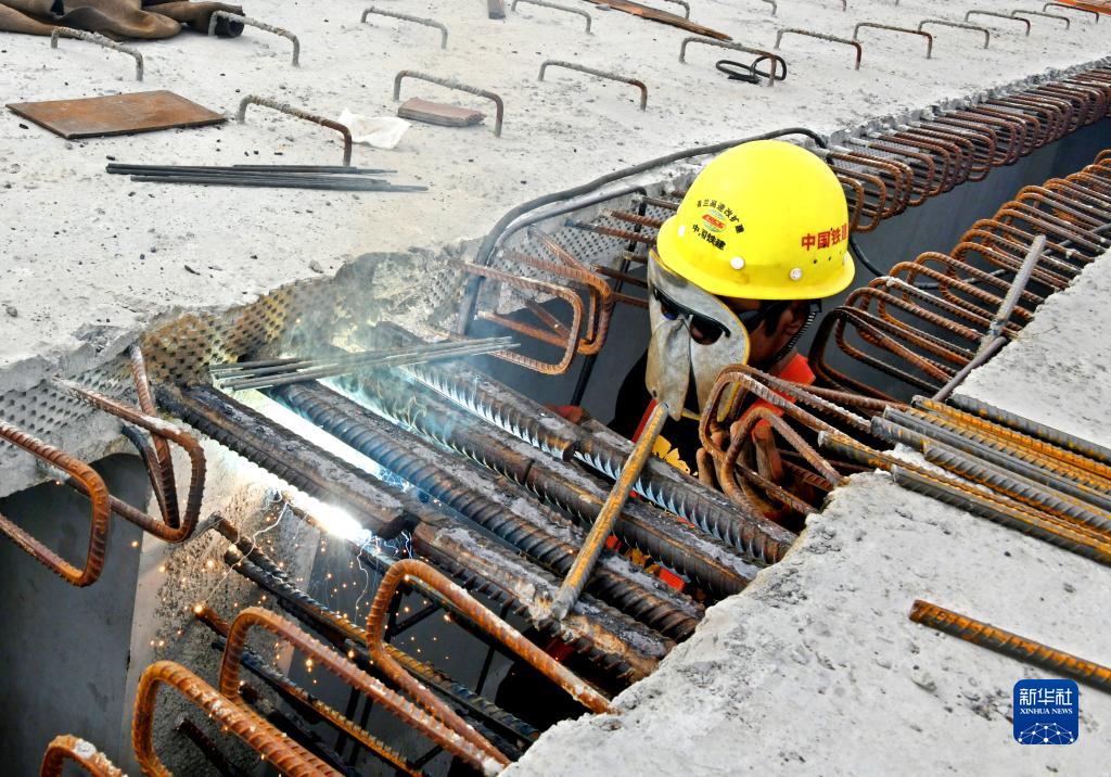 10月30日,一名中铁十四局建设者在青兰高速公路双埠至河套段女姑口特大桥上焊接钢梁。