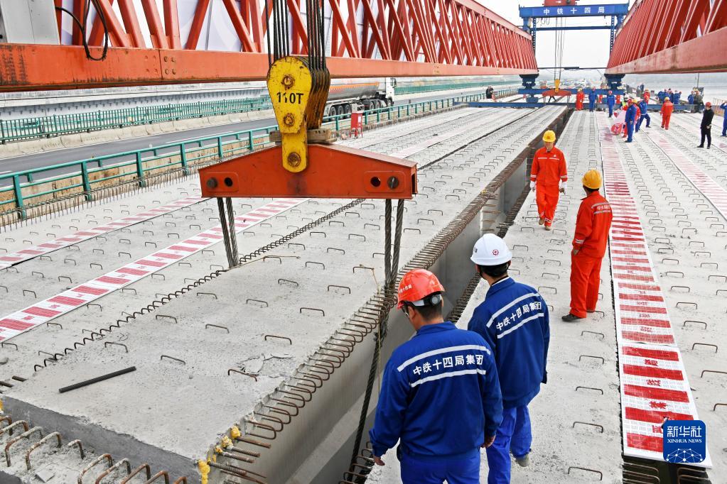 10月30日,青兰高速公路双埠至河套段女姑口特大桥施工现场,中铁十四局建设者在吊放最后一片50米T梁。
