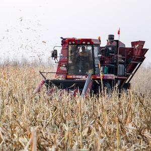 10月29日,在内蒙古通辽市科尔沁左翼中旗花吐古拉镇三家子村的盐碱化耕地改良试点示范区,农机手驾驶收割机收割玉米。