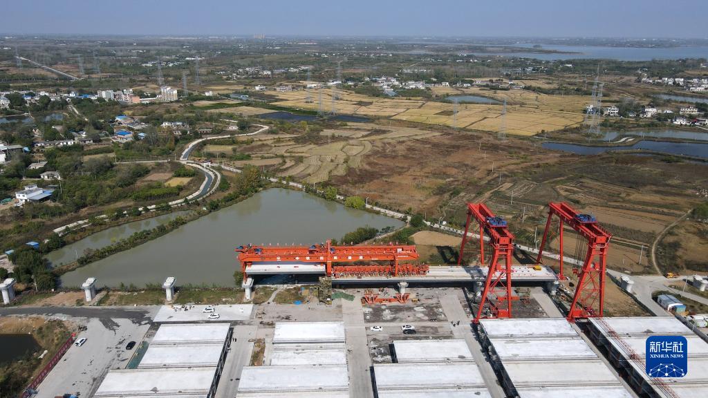 这是中铁四局合新铁路安徽段站前七标箱梁架设现场(10月30日摄,无人机照片)。