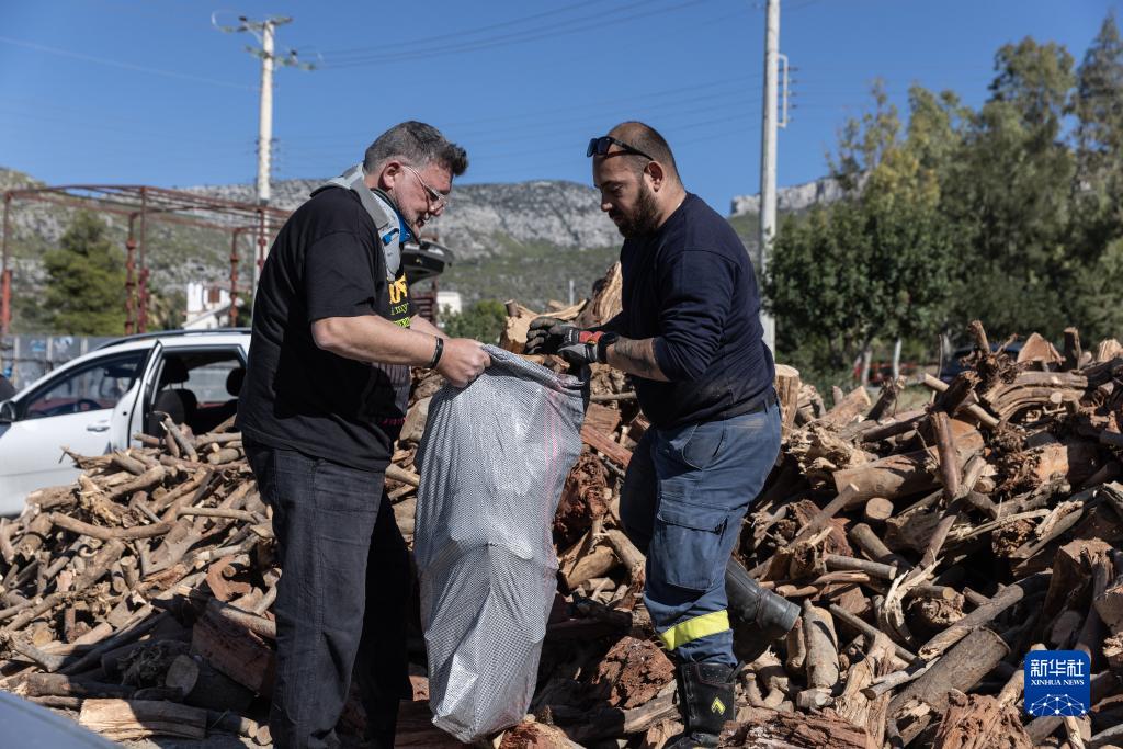 10月20日,在希腊首都雅典南郊的格利法达,工作人员(右)帮助居民拾取免费木柴。